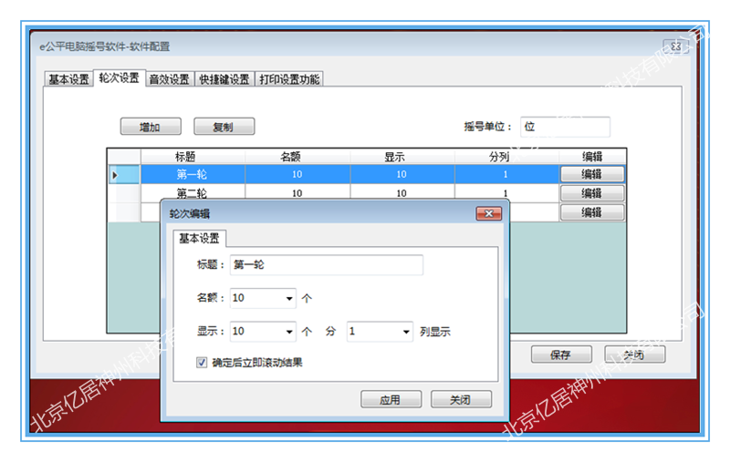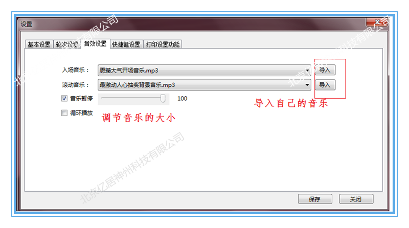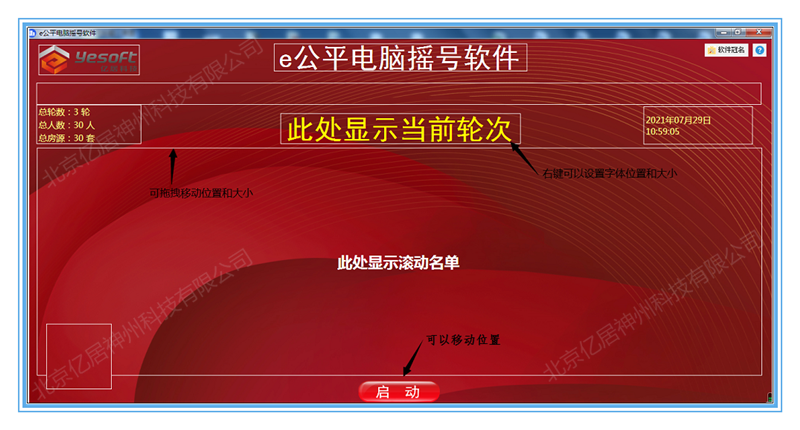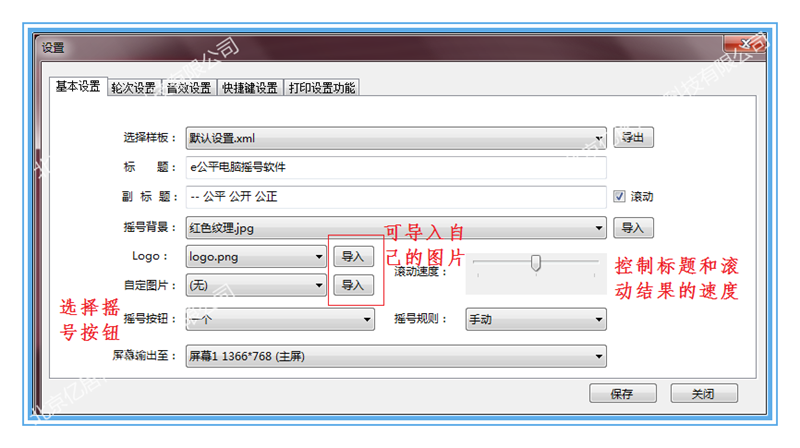 可自定义主、副标题、背景图、背景乐、logo、摇号按钮、滚动速度等。背景图大小应在5M以内尺寸1900*1200。