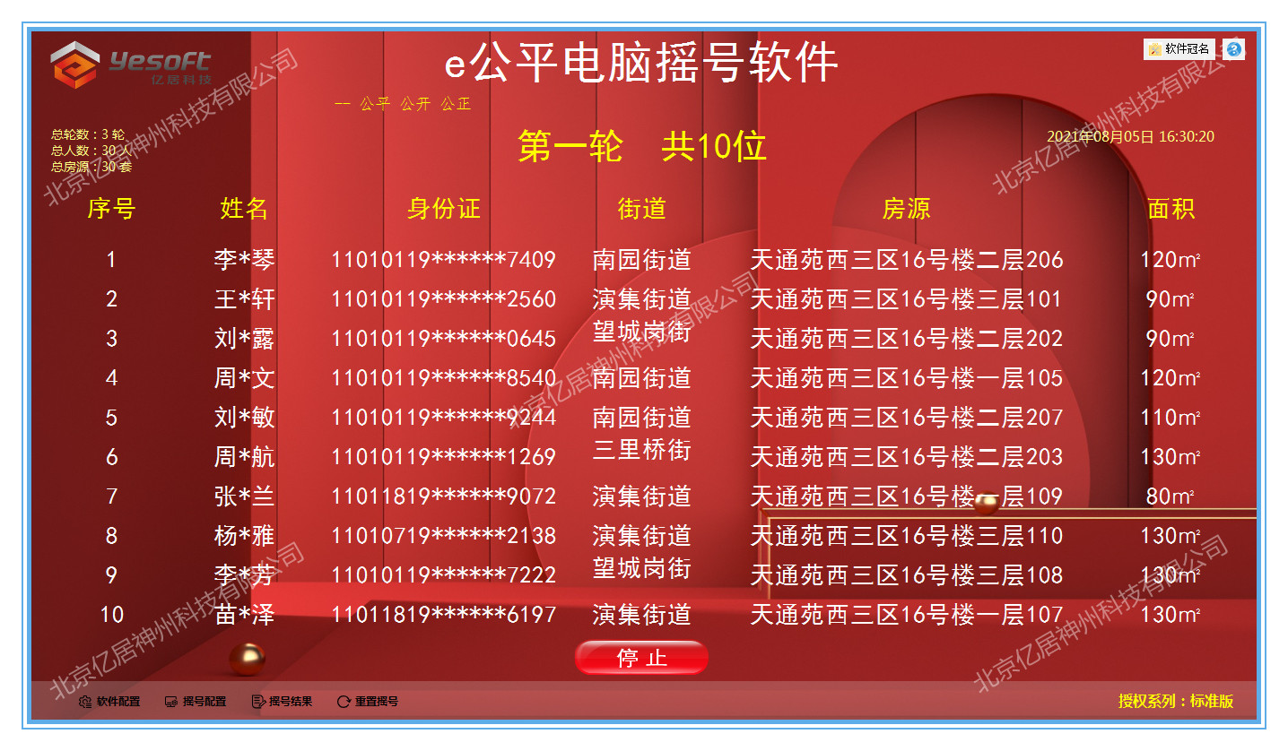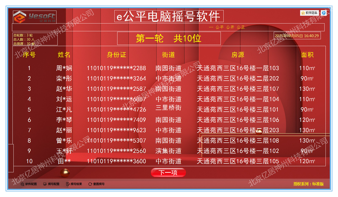 e公平电脑摇号软件支持自定义摇号方案、摇号背景、音乐、快捷键等方案设置。支持数据批量导入和手动录入,数据核验消重等数据设置。支持摇号方式可以分批摇号、摇顺序号、逐一摇号等各种方式设置。支持摇号过程中数据随机匹配,公平公正,摇号过程进行追加、放弃、作废、补缺等操作设置。支持摇号结果打印、查询、导出pdf等电子文档,方便存档。软件界面功能清晰明了,操作起来简单易用。另外我们提供软件定制,可以根据客户的需求来针对性定制开发软件。