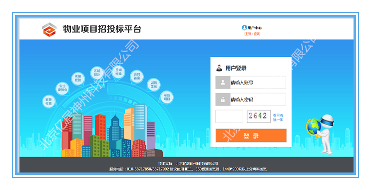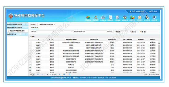 《 物业招投标监管平台》,基于物业服务市场政务审批和行业监管业务需求,搭建贯穿省—市—县—企业—业委会—社会公众的物业监管应用平台,建立起辖区内物业服务市场的企业库、人员库、项目库、信用信息库等多个专项数据库,实现物业管理部门对企业的区域备案、招标备案、中标备案、公告发布、专家抽取、等多重政务管理功能。